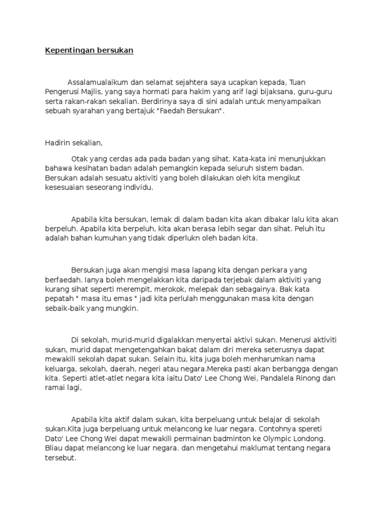 Contoh Karangan Bahasa Malaysia. Sukan bukanlah semata-mata aktiviti fizikal yang dilakukan untuk mengisi masa lapang atau sebagai riadah kecil mengeluarkan peluhMutakhir ini pemodenan sukan bergerak seiring dengan kemajuan dunia dan membawa falsafah yang lebih berat. KEPENTINGAN Sukan melahirkan insan yang cergas dan cerdas Huraian.