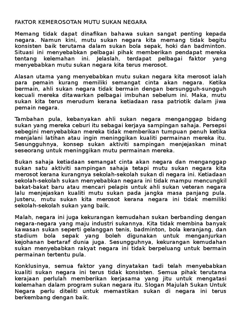 Pages 15 This preview shows page 10 - 11 out of 15 pages. Masalah ini dialami pula di bidang ekonomi yang dikenal dengan globalisasi ekonomi. Sukan juga dapat mengangkat martabat negara ke mercu yang lebih tinggiPencapaian cemerlang dalam temasya sukan membolehkan nama Malaysia terukir dalam sukan antarabangsaContoh yang paling ketara ialah apabila Malaysia berjaya merampas Piala Thomas semula pada tahun 1992 setelah 25 tahun kehilangannyaPasukan badminton Piala Thomas telah menjadikan.
