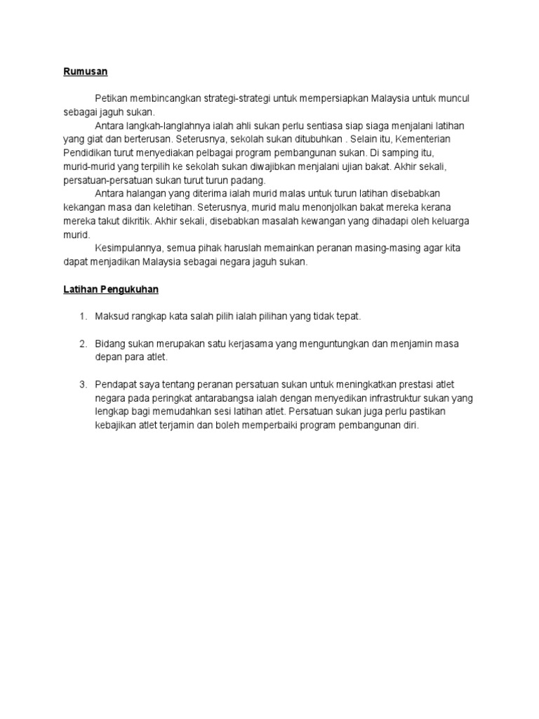 2m P3 Petikan Rumusan membincangkan kesukaran-kesukaran kesulitan-kesulitan yang melanda bidang sukan. Banyak cara yang dapat diupayakan dimulai dengan melakukan program-program serta kebijakan-kebijakan. Begitu pula jenis mode pakaian dan makanan yang hampir sama di berbagai negara.