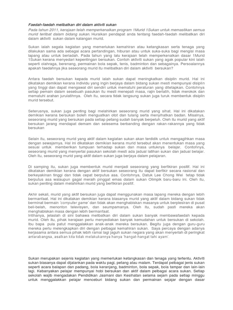 Huraikan pendapat anda tentang faedah-faedah melibatkan diri dalam aktiviti sukan dalam kalangan murid. Huraikan faedah-faedah yang anda peroleh dengan menyertai aktiviti sukan di sekolah. Karangan Resume Spm Contoh Karangan Essay Bahasa Inggris - USA Momo.
