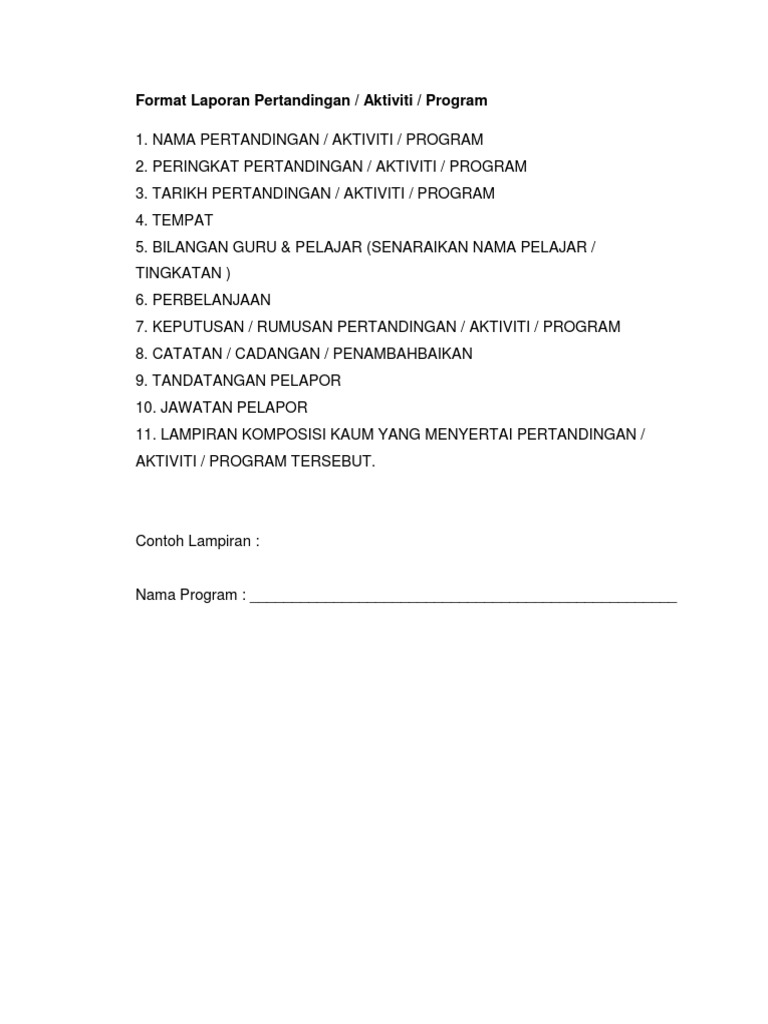 Format laporan penyetaan pertandingan sukan. PENGELOLAAN KEJOHANAN SISTEM PERTANDINGAN. CONTOH LAPORAN PERTANDINGAN BOLA TAMPAR10 PENGENALAN Padasetiaptahun MajlisSukan Sekolah-sekolahDerahPetalingtelahmengadakanKejohananBola Tampar Daerah. Buku laporan mingguan aktiviti kokurikulum dunia sekolah buku.