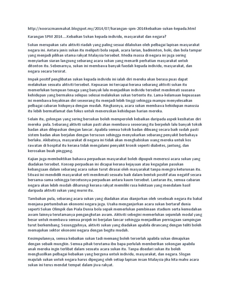 Huraikan tindakan-tindakan yang boleh diambil untuk memajukan sukan di negara ini. Karangan Perpaduan Kaum di Malaysia. Bidang sukan yang dianjurkan ini bukan sahaja membawa pelbagai faedah kepada atlet negara tetapi dapat mengharumkan nama Malaysia di persada.